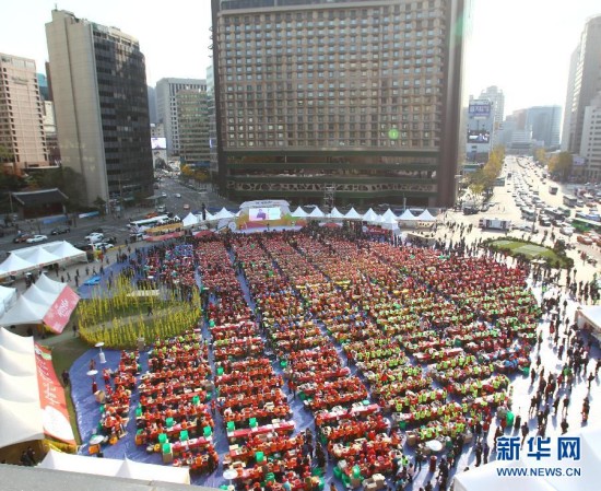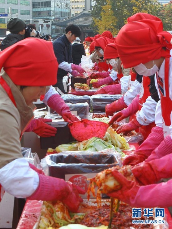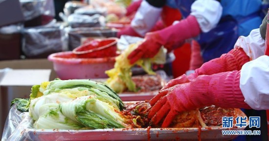 11月14日,两千余人在韩国首尔市厅广场同时制作泡菜。当日,韩国首尔举行泡菜狂欢节。两千余人在首尔市厅广场同时制作上万颗泡菜。腌制好的泡菜将分发给首尔市的困难家庭和沉船“岁月”号遇难者家属。泡菜是韩国人一日三餐中必不可少的一道传统饮食。每年冬天,韩国家家户户都要腌制大量泡菜以备过冬。2013年联合国教科文组织正式将韩国的腌制越冬泡菜文化列入教科文组织人类非物质文化遗产名录。新华社记者姚琪琳摄