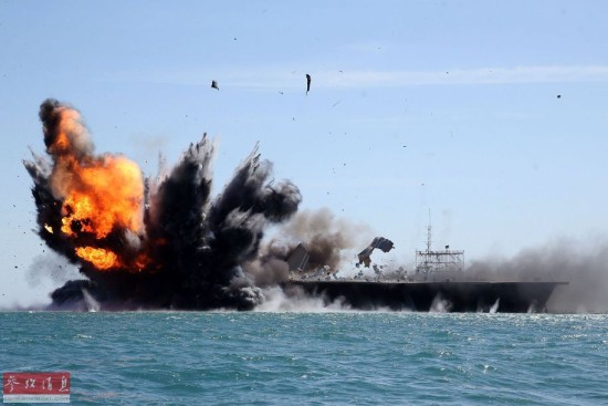 当地时间2015年2月25日,伊朗南部霍尔木兹海峡,伊朗革命卫队于霍尔木兹海峡举行军事演习。图为军演爆炸瞬间。