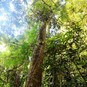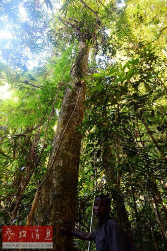 资料图片:2013年11月22日,在位于马达加斯加东北部阿钦安阿纳雨林的马约杰季国家公园,导游手扶一棵红木。红木是非洲被非法砍伐的主要树种之一。新华社记者吴晓凌摄。