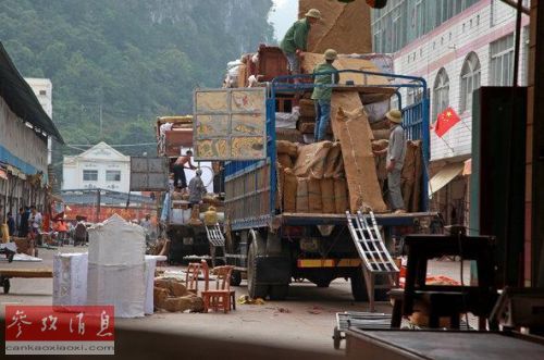 在中越边境的广西浦寨,工人们正在卸载经过半加工包装好的红木。