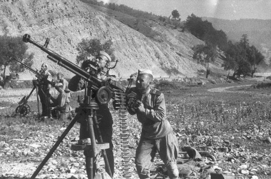 战役于1945年4月16日发起,先后突破奥得河、尼斯河防线。25日对柏林形成包围。图为高射机枪正在防空,确保运输道路的安全通畅。