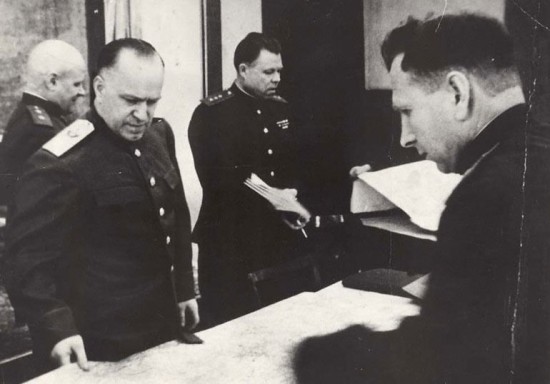 苏军共集中了白俄罗斯第1、2方面军、乌克兰第1方面军等三个方面军270个师和骑兵师,20个坦克军和机械化军,14个空军集团军,共250万部队。图为特勒金中将、朱可夫元帅、马利宁上将和瓦伦丁·瓦伦尼科夫(左起)正在制定柏林战役的作战计划。