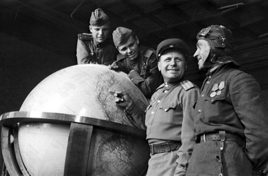 由于有了斯大林格勒的经验,苏军战士们知道如何去攻占一个城市。苏军在进攻前首先用火炮和飞机对目标地域进行轰击,步兵在坦克和配有喷火器和爆破器材的工兵掩护下前进,从后院、地下室甚至地下铁道和下水道渗透进去,攻占每一条街道,每一座楼房。图为希特勒办公室的地球仪。