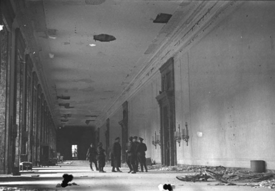 1945年4月26日清晨,在柏林上空,苏军数千架飞机再一次投下了成千上万吨的炸弹和汽油弹。在地上,平均每英里已部署到近千门的各种火炮集中射击。轰炸和射击结束后,朱可夫的白俄罗斯第1方面军派出无数个突击群和突击分队,从四面八方向市区突进。图为苏军攻入德国首相府。