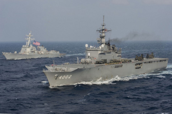 资料图片:日本海自大隅级登陆舰和美国宙斯盾舰编队行进。(图片源于网络)