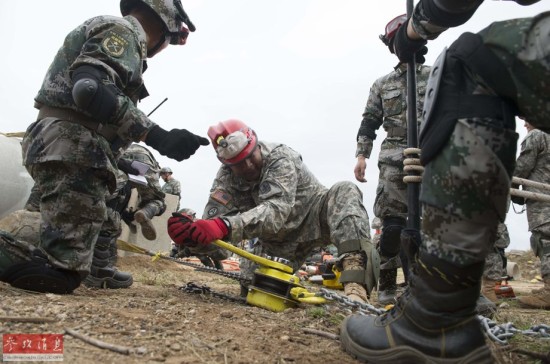11月14日,在美国夏威夷,中美两军参演人员合作在障碍物上钻孔。新华社记者杨磊摄