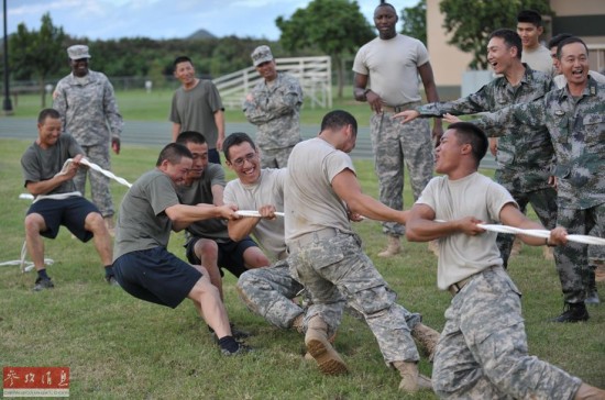 11月13日,在美国夏威夷,中美双方进行混合拔河友谊赛。当日,参加中美两军联合演练的人员在夏威夷贝洛斯军营进行了救援减灾室内推演和文体交流活动。新华社发(李晓伟摄)