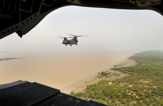 载着三国士兵的澳军CH-47起飞。