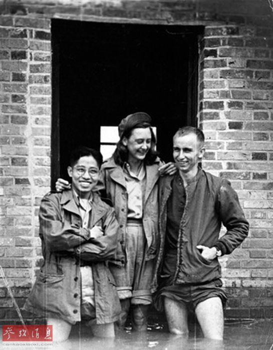 在印度期间,贝蒂帮助制造了假新闻、假无线电电报和其他旨在散播假情报以打乱日军行动计划的宣传。当时,日军因在因帕尔平原被盟军打败而意志消沉。图为贝蒂(中)与战友们挽着裤腿站在水中合影。