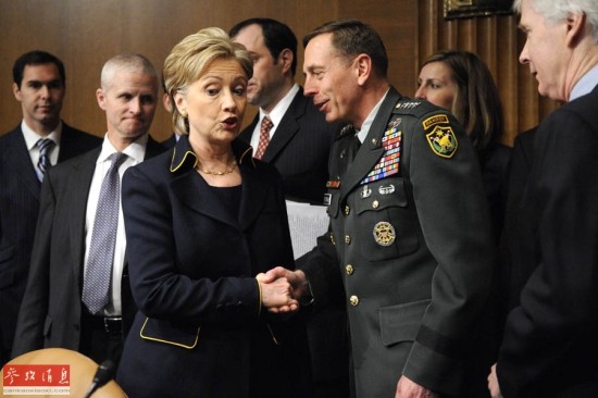 彼得雷乌斯政坛生涯回顾:2008年4月8日,驻伊拉克美军最高指挥官彼得雷乌斯(前右二)在美国华盛顿举行的听证会开始前问候美国参议院军事委员会成员、民主党总统竞选人希拉里·克林顿(前左)。希拉里当天在参议院听证会上就伊拉克问题发言,要求启动“有条理撤离部队”的程序。