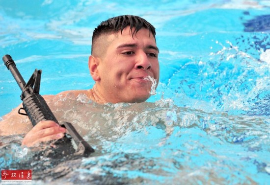 4月8日,在位于韩国东豆川的凯西营营地,美军士兵在2014年“最佳战士”竞赛中做水中生存测试。据报道,美国第二步兵师一年一度的“最佳战士”竞赛在16名士兵中展开。