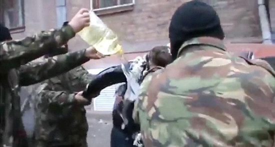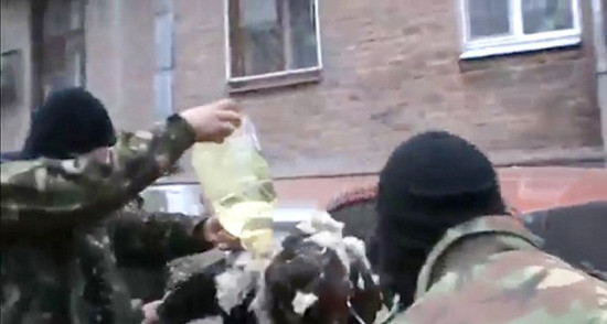 这些人将瓶子里的液体淋到科米萨尔头与肩上,后者则使劲挣扎。