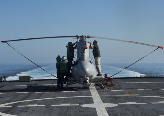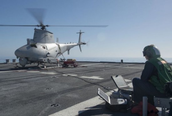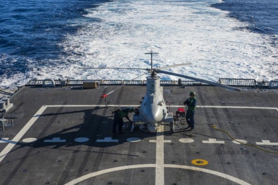 2014年12月17日,美国海军HSM35中队在濒海战斗舰LCS-3沃斯堡舰上测试MQ-8B“火力侦察兵”无人作战侦察直升机,测试海域在西里伯斯海。