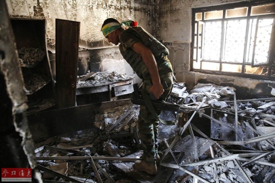 图为2014年9月3日,伊拉克Sulaiman Pek,库尔德武装查看“伊斯兰国”被烧毁的新闻办公室。在打破“伊斯兰国”组织对阿迈尔利镇长达2个多月的围困后,9月1日,伊拉克政府军又夺回附近的军事重镇苏莱曼贝克镇。