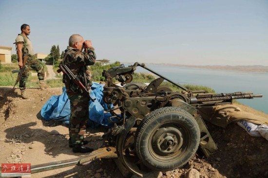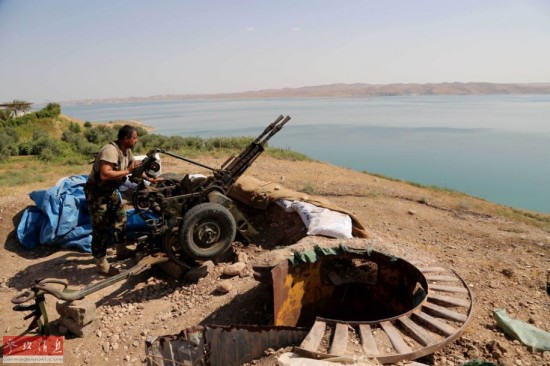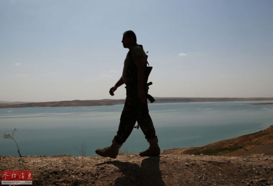 8月17日,在伊拉克尼尼微省的摩苏尔水坝附近,库尔德武装士兵进行警戒。据伊拉克官方电视台18日报道,伊政府军和库尔德武装当天联手夺回被极端组织占领的伊拉克最大的摩苏尔水坝。新华社美联