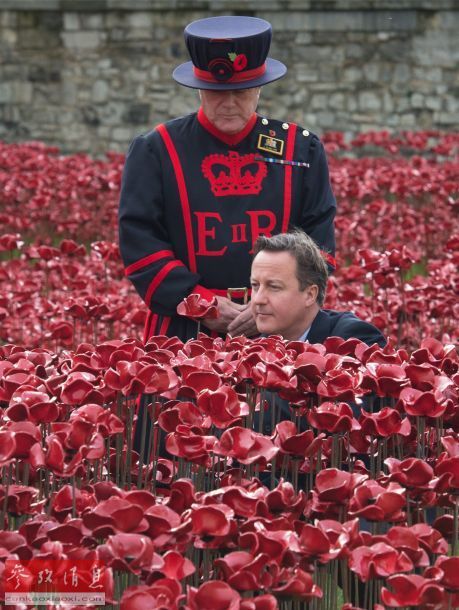 11月8日,在英国伦敦,英国首相卡梅伦向伦敦塔的“虞美人花田”献上一支陶瓷制虞美人。这片陶瓷虞美人花田是名为“血染大地与海洋”的装置艺术品的一部分,该艺术品意在纪念百年之前爆发的第一次世界大战。