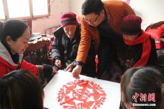 禹州市的青年民间剪纸艺术家马旭东将自己准备的作品送给老人。朱清 摄