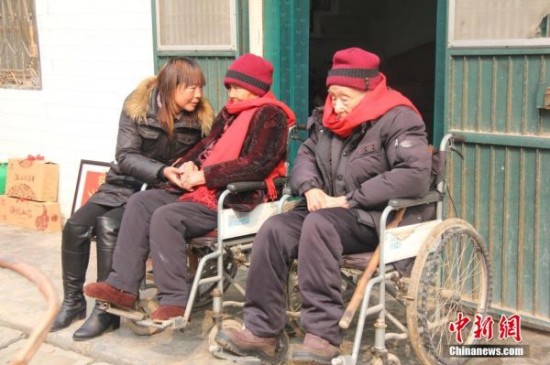 2月16日,穿着新衣、新帽的平木虎和张新妞正在孙媳的陪伴下,坐在收拾得干净利落的小院里晒着暖阳,整整一个世纪的沧桑,如今都写在了张新妞老人的脸上,虽说已是百岁高龄,但她身体依然硬朗,精神矍铄,很喜欢和大家交流。当地一爱心企业为老人送去了年货和问候,随行的医护人员认真给两位老人做了身体检查,记者发现,当医生为一位老人检查时,另一位就一直望着对方,检查完赶紧看着医生等着结果,“两位现在的身体状况良好,希望你们继续保持下去,健康长寿!”听完医生的话,两位老人露出孩子般童真的微笑,“中中!大家都好好的,好好的过年!”平木虎老人说。