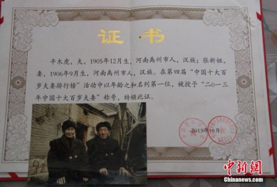 中新网禹州2月16日电 (师红垒 朱清)结婚50年为金婚,60年则为钻石婚。而家住河南省禹州市范坡的一对夫妻,却已经携手走过了90年的光阴,跨越两个世纪,他们的年龄加在一起已经217岁,如今五世同堂,儿孙70多口。2014年,109岁的丈夫平木虎与108岁的妻子张新妞夫妇以年龄和第三次蝉联十大百岁夫妻排行榜榜首。