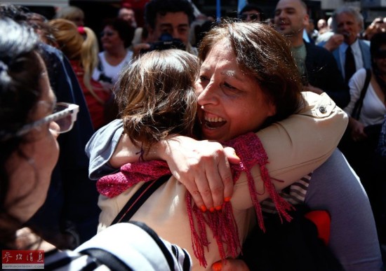 10月8日,在阿根廷布宜诺斯艾利斯,阿根廷总统克里斯蒂娜的支持者在医院外拥抱庆祝。新华社/路透