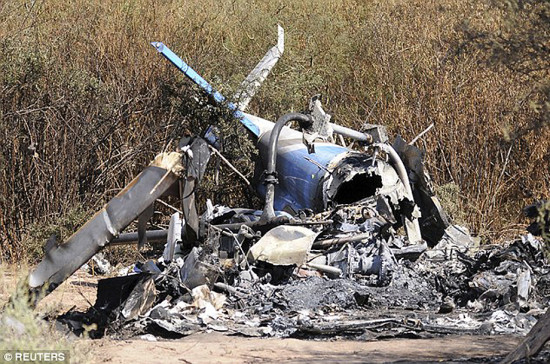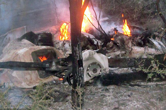 相撞坠地后,其中一架的直升机仍在燃烧。