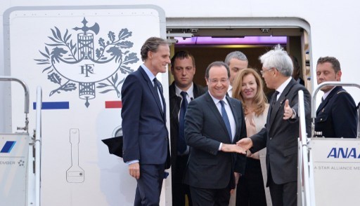 图为法国总统奥朗德和女友瓦莱丽抵达日本。