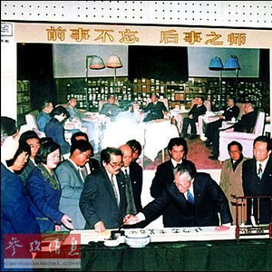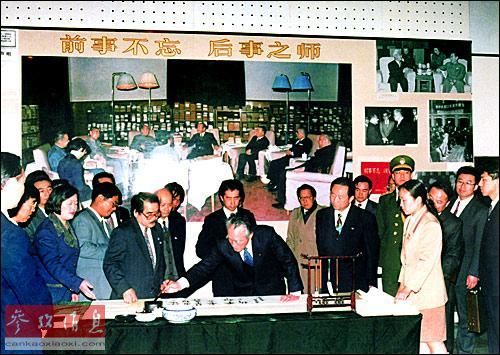 1995年,日本首相村山富市(中)访华,他在参观中国人民抗日战争纪念馆时,在留言簿上写下:“正视历史,祈日中友好、永久和平。”(资料图片)
