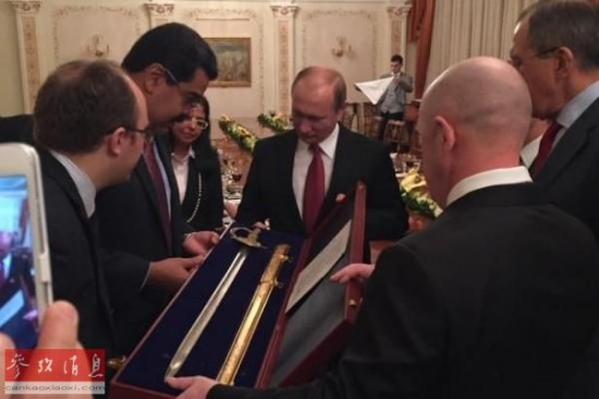委内瑞拉通讯社援引马杜罗的话说:“会面结束后,普京总统送出了给委内瑞拉全体人民的礼物,令我们倍感意外。这是一份印证我们两国关系水平的真正美妙的礼物,是解放者西蒙·玻利瓦尔所用过佩剑的复制品。”