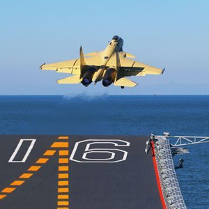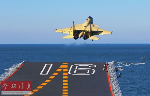资料图片:歼-15舰载机在航空母舰“辽宁”舰上滑跃起飞。新华社记者 查春明 摄