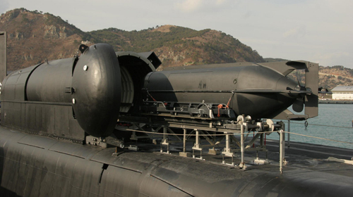 美国曾将4艘俄亥俄级战略导弹核潜艇,改装为巡航导弹兼具特战用核潜艇,其中22个弹道导弹发射筒改装为每筒装载7枚“战斧”巡航导弹,剩余两个发射筒各安装一个“先进海豹输送系统”(Advanced SEALDelivery System,ASDS),SEAL为海豹特战队的英文缩写,作为特战用途。这个系统的另一个名称叫“干式甲板换乘舱”(Dry DeckShelter,DDS),简单说就是一个船坞掩体,简称“坞舱”,用来回收和放出袖珍潜艇,袖珍潜艇的舱口与核潜艇的密封舱口对接,海豹队员便可进入袖珍潜艇。