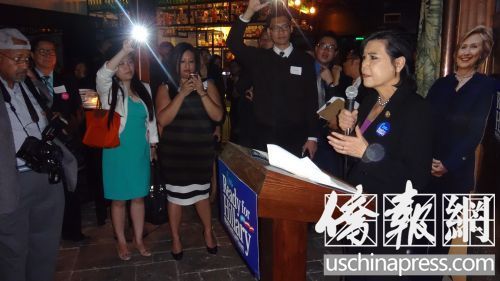 美国首位华裔女国会众议员赵美心支持希拉里竞选美国首位女总统。(美国《侨报》/高睿 摄)