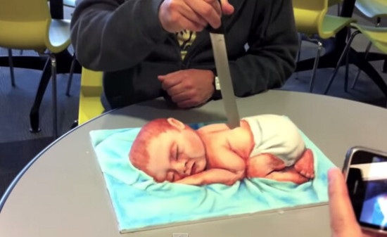 据台湾东森新闻网3月20日报道,Dan Gentle在2009年制作了第一个婴儿蛋糕,还把影片拍下上传网上引发网友讨论。2011年他做蛋糕的技术更加成熟,为了庆祝自己的粉丝顺利怀孕,决定再次挑战“婴儿蛋糕”,这次他不但把制作及剖开过程拍下,更亲自试吃了几口,画面不禁让人想大喊:“吃人啦”!