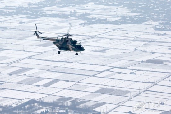 西北二月,兰空航空兵某团直升机飞翔在被白雪覆盖的平原上空。