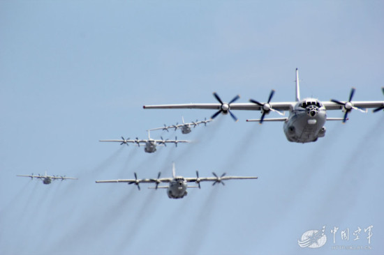 中原三月,广空运输航空兵某团大机群密集编队跟进训练。