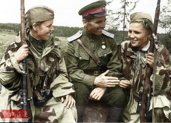 图为身穿迷彩伪装服的苏军女狙击手与军官交流。
