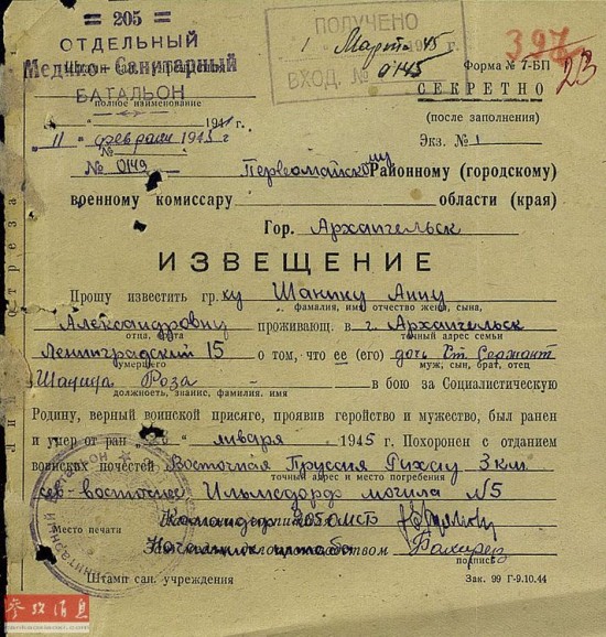 沙妮娜的战斗日记于1965年出版。图为苏军第205独立医疗营寄给沙妮娜母亲的死亡证明。
