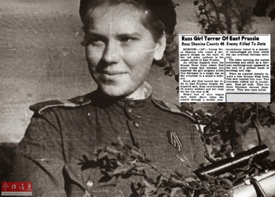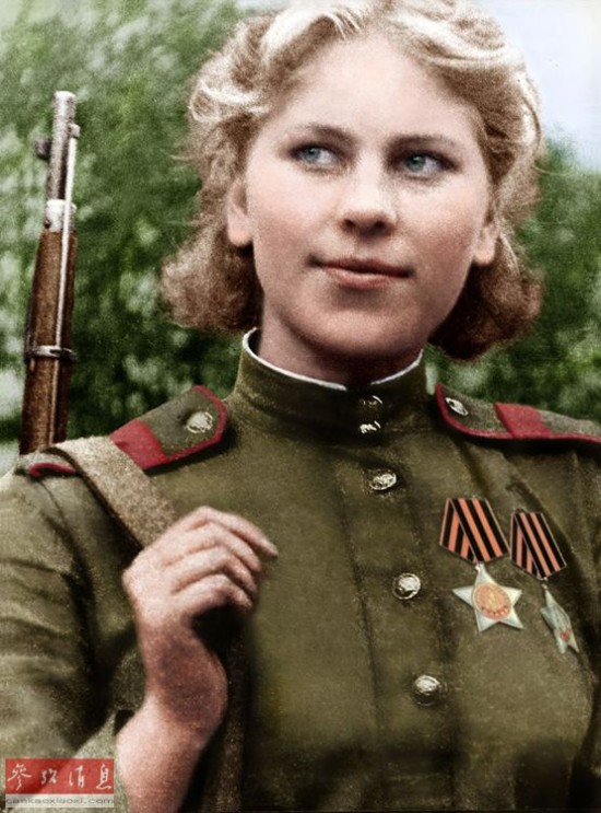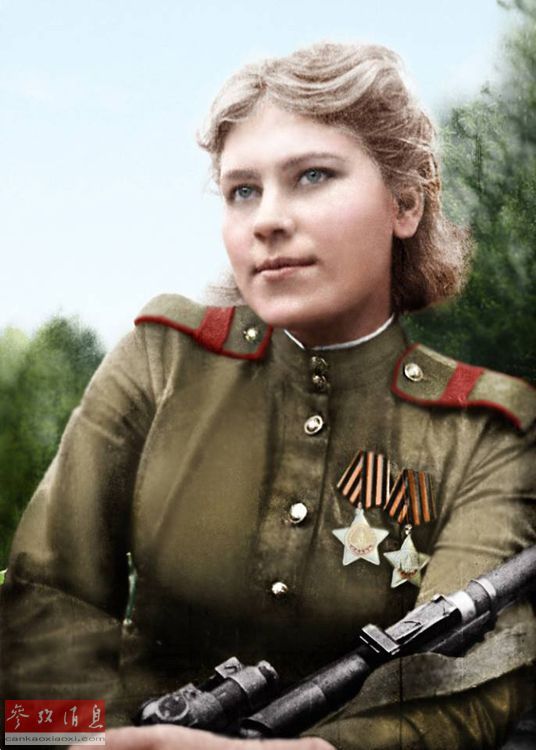 罗扎.沙妮娜(Roza Shanina),生于1924年4月3日,卒于1945年1月28日,是一位著名的二战苏军王牌女狙击手,拥有59个已确认的狙杀记录,其中在1944年7月 苏军解放维尔纽斯(今日立陶宛的首都)的战役中狙杀了12名德军。图为沙妮娜戎装照的彩色复原图。