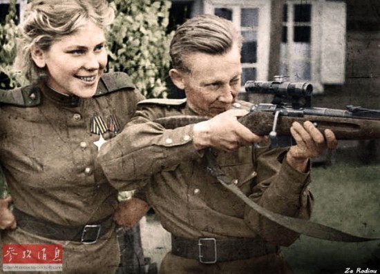 沙妮娜在战场上表现出了优异的狙击技巧,她曾创造过在短时间内快速狙杀“2发2中”的记录,而且狙杀的都是移动目标。图为沙妮娜指导战友如何使用狙击步枪(彩色复原照)。