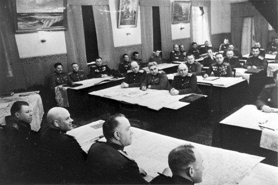 图为进攻前,乌克兰第一方面军司令朱可夫元帅和各参战部队的高级军官正在进行沙盘演习,商讨攻克柏林的战役步骤。
