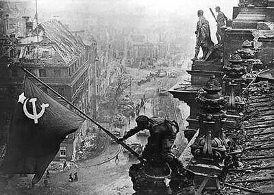 1945年4月20日下午3点,白俄罗斯第1方面军编制内的第3突击集团军第79军的远程炮兵首先向柏林开炮。经过近一天的战斗柏林接近地的德军防线被突破。德军防御部队在先前的战斗中遭到惨重损失已极度疲惫,无法阻挡占据优势的苏联红军的强大突击。图为红旗插上了国会大厦。