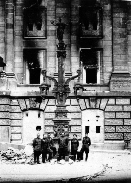 1945年4月26日清晨,在柏林上空,苏军数千架飞机再一次投下了成千上万吨的炸弹和汽油弹。在地上,平均每英里已部署到近千门的各种火炮集中射击。轰炸和射击结束后,朱可夫的白俄罗斯第1方面军派出无数个突击群和突击分队,从四面八方向市区突进。图为苏军攻入德国首相府。