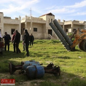 3月8日两个激进组织宣称叙利亚政府空袭叛军控制的首都郊区,已经造成至少十人死亡。图为“Borkan (“Volcano”)”发射的炮弹,射程近两英里。
