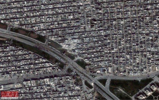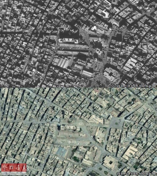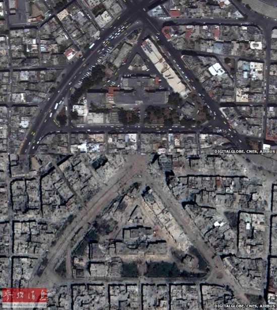 哈马市的整个Masaa Al Barbaeen城区都已经在连年的战火中被夷为平地,该区总计有3256栋建筑。上图摄于2010年8月,下图摄于2012年10月。(图片来源 数字地球网站)