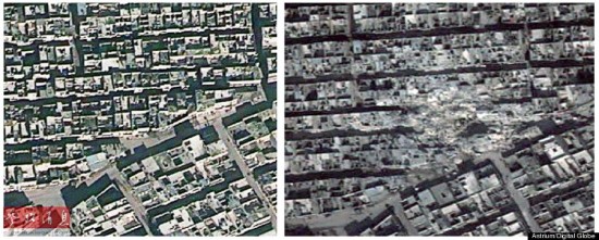 这两张卫星图显示,阿勒颇的Jabal Badro区部分建筑已被战术导弹摧毁,本图摄于2012 年12月15日。