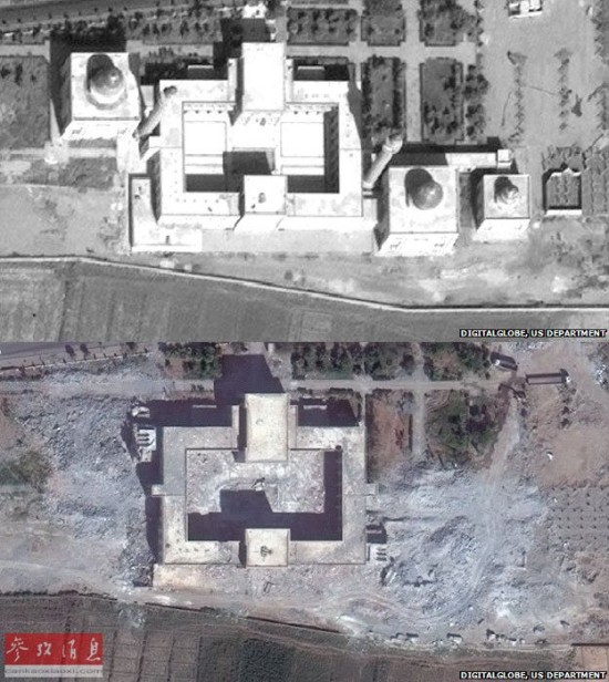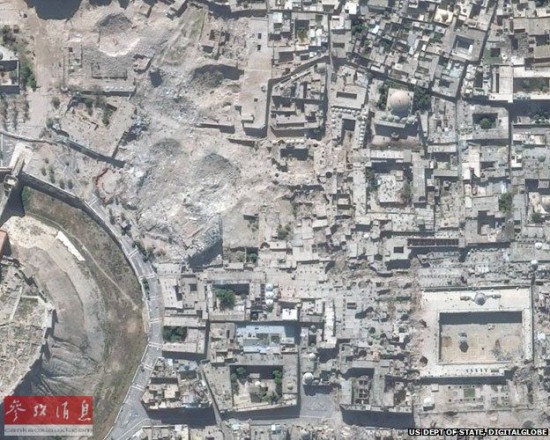 两张拍摄于阿勒颇的卫星对比图显示, Umayyad清真寺的一部分已于2013年4月被摧毁。