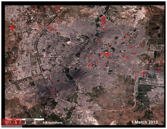 这张卫星图上的红点显示了阿勒颇自2013年2月24日至3月1日新增的受战火毁坏的区域。