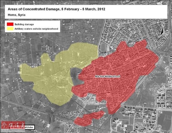 本图拍摄的是霍姆斯市郊的受损情况,拍摄时期是2012年2月至3月,黄色区域为重型火炮轰出的弹坑,红色区域为受损的建筑。
