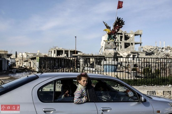 3月22日,在叙利亚艾因阿拉伯(又称科巴尼),一名库尔德女孩从车窗内探出身子向外张望。艾因阿拉伯(又称科巴尼)是叙利亚与土耳其交界地区重镇。“伊斯兰国”自去年9月16日起持续攻打艾因阿拉伯,并攻占周边多个库尔德人村庄。在美国等多国战机支援下,库尔德武装今年1月下旬从“伊斯兰国”武装手里夺回艾因阿拉伯以及周围数十座村庄。战争让这座城市变为废墟。新华社/法新 ??