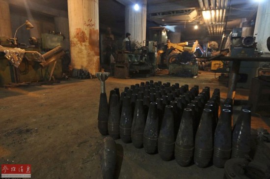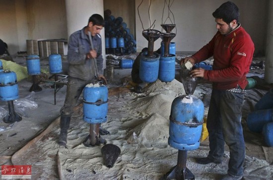 叙利亚人权观察组织说,在伊拉克边境附近的,第二组的枪手袭击了一个伊斯兰国组织在城里的检查站。图为在阿勒颇农村的一个武器工厂,工人们正在向煤气罐里面装入火药。
