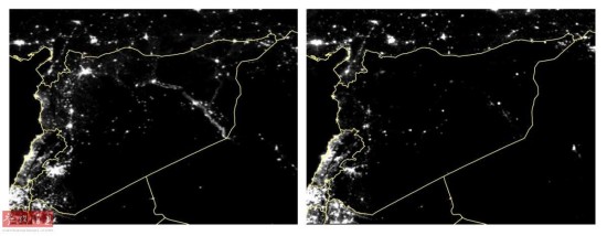 卫星图显示,过去4年中,叙利亚超8成地区陷入黑暗,左图摄于2011年3月图, 右图摄于2015年2月。(美联社供图)